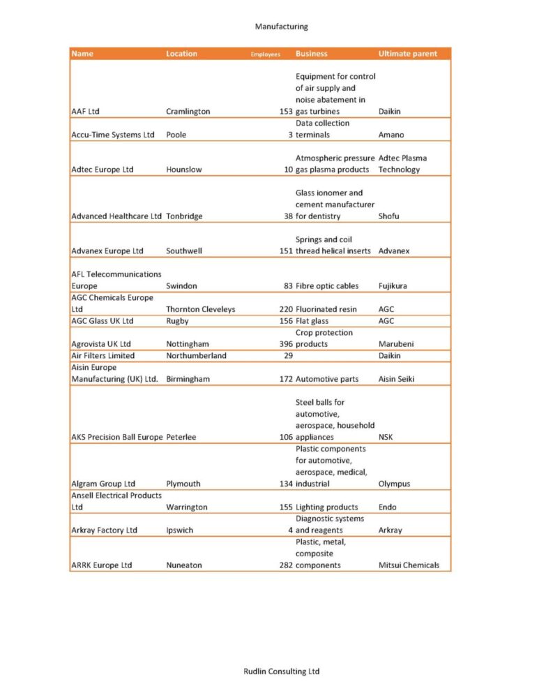 July 2023 directory of 203 Japanese companies with manufacturing/production operations in the UK, giving their full name, city/town where located, employee total where available, description of their products and their ultimate parent company name.